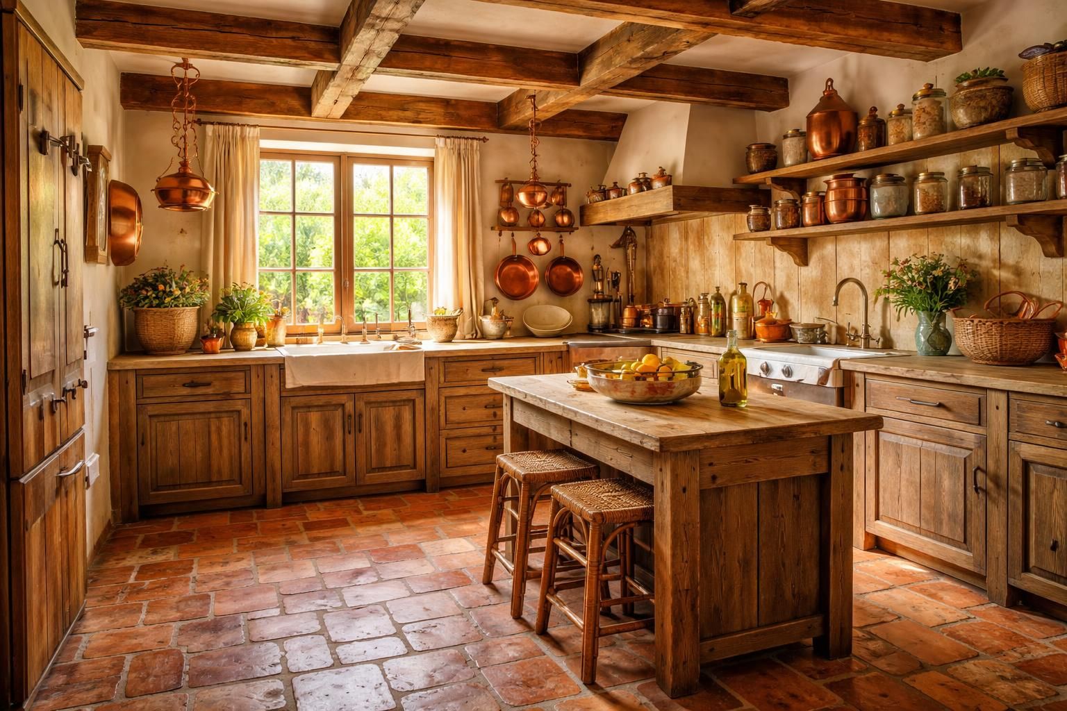 Pour les adeptes du style rustique, le sol en terre cuite s’impose comme un incontournable. Associé à des éléments en bois massif, des ustensiles en cuivre et des textiles naturels, il crée une ambiance chaleureuse et authentique. Les couleurs naturelles des tomettes mettent en valeur les tons terreux typiques de ce style, renforçant ainsi la cohérence visuelle de l’ensemble.