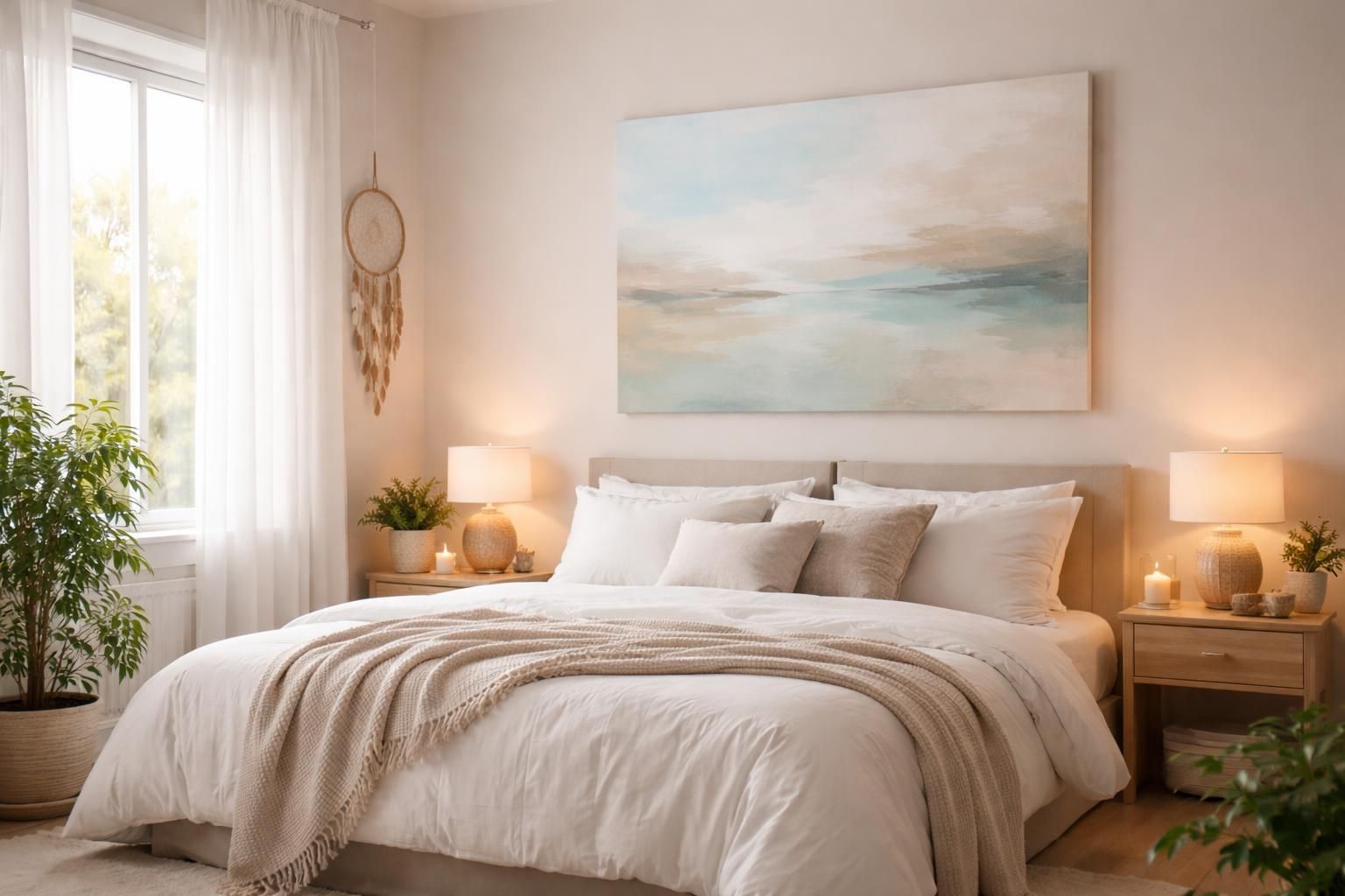 Pour maximiser les bienfaits du Feng Shui, il ne suffit pas de se concentrer uniquement sur le tableau au-dessus du lit. D’autres éléments tels que la literie, les couleurs des murs et l’éclairage doivent également être harmonisés. Par exemple, choisir une literie en matières naturelles, comme le coton biologique, renforce le sentiment de confort et de connexion à l’environnement. Les couleurs des murs devraient être en accord avec le reste de la décoration, tout en restant dans des teintes apaisantes.